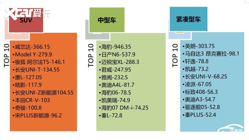从车型分布来看,SUV仍然是投诉指数占比最高的品类。威兰达、Model Y、极狐 阿尔法T5构成SUV榜单前三,投诉指数均涨超2倍以上。紧随其后的是中型车,遭遇集中投诉的海豹、日产N6、迈锐宝XL等车型成了幕后推手。紧凑型车位列第三,其中英朗重回榜首投诉指数环比上涨了292.44%。