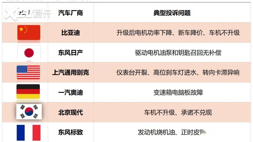 具体来看,比亚迪成了投诉指数最高的中国品牌,多车升级后电机功率下降成了新的吐槽点。东风日产代替广汽本田成为日系车的重点投诉对象。日产N6驱动电机油泵和钥匙召回无补偿引发车主不满。除英朗、迈锐宝XL、君威外,Model Y也是美系车投诉问题的“重灾区”。大众、奥迪、奔驰构成德系车投诉榜单前三,前两者因变速箱电脑板故障遭到投诉,后者因升级后电池锁电引发不满。