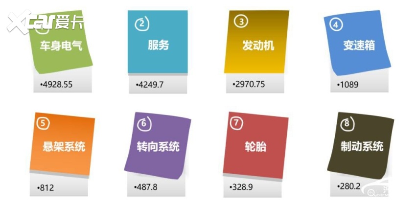 投诉指数:汽车门网全新构建汽车投诉指数计算模型(简称:QCMS),将车型质量投诉分为八大类,根据发动机、变速箱、车身及电气、制动系统、转向系统、悬挂系统、轮胎、服务等问题影响严重性分别赋权,并对集中性事件额外加权,最终形成有效投诉指数,指数越大越严重。