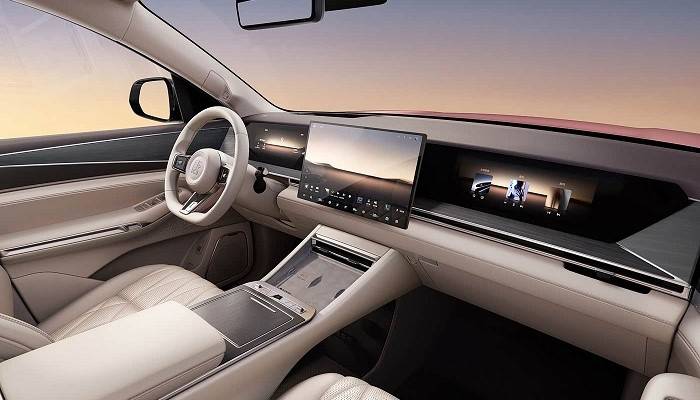 内饰部分,新车中控台、方向盘等处以木纹饰板点缀,配备内嵌式全液晶仪表、悬浮式中控屏、手机无线充电、HUD抬头显示及后排中央扶手等配置。其核心智能化配置包括华为鸿蒙座舱5.0操作系统,并搭载了来自Momenta的R6智能驾驶辅助系统。